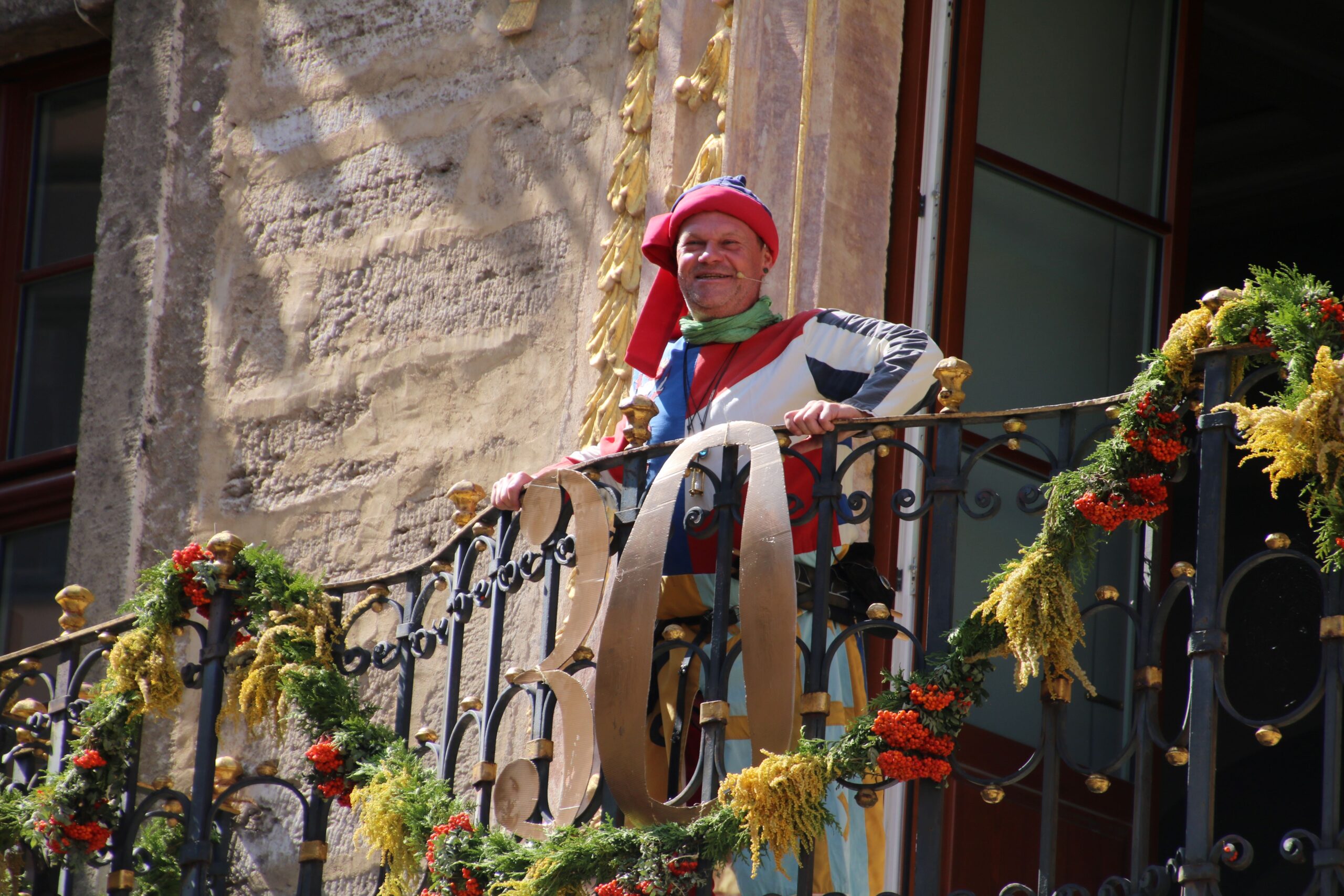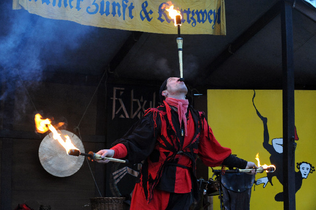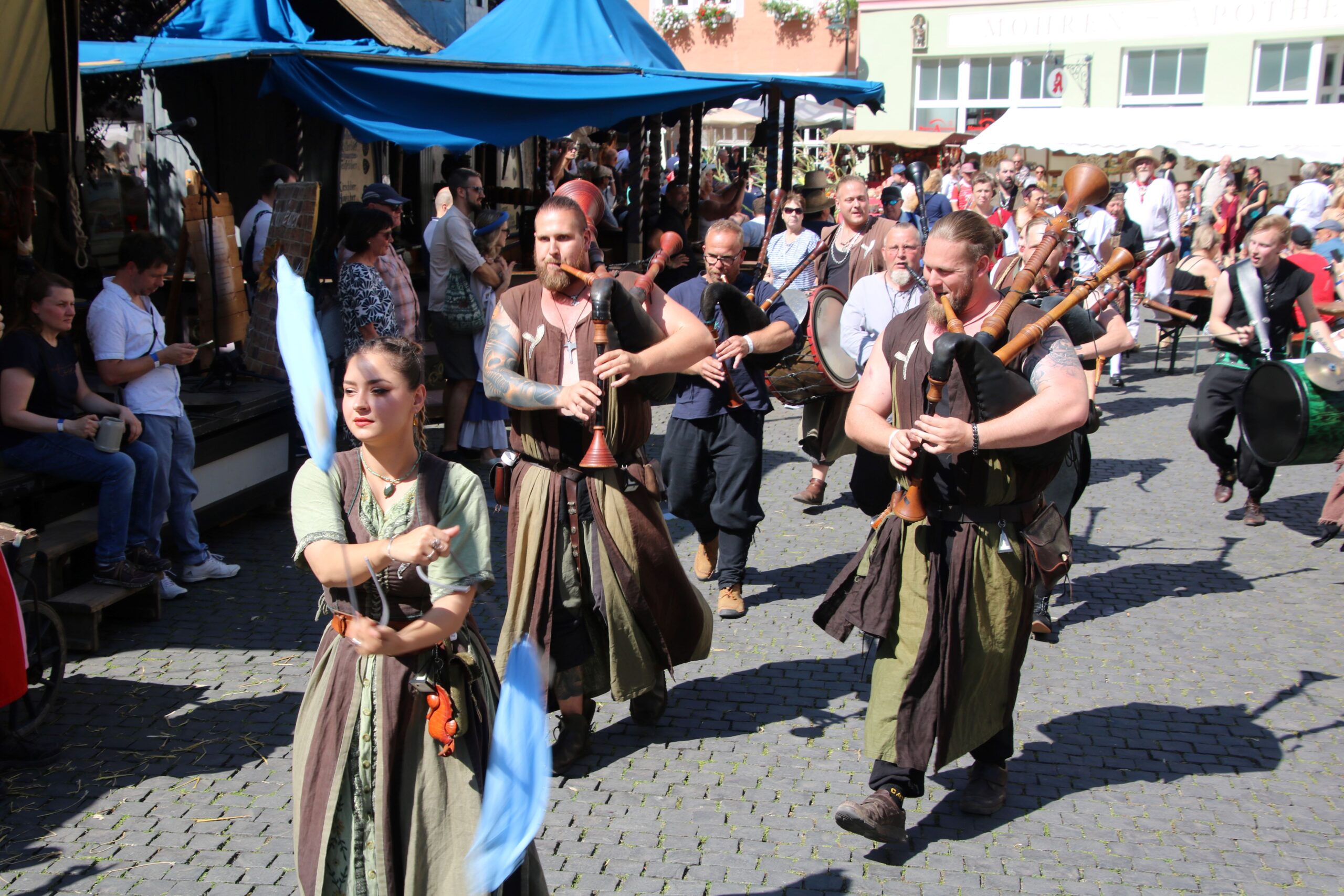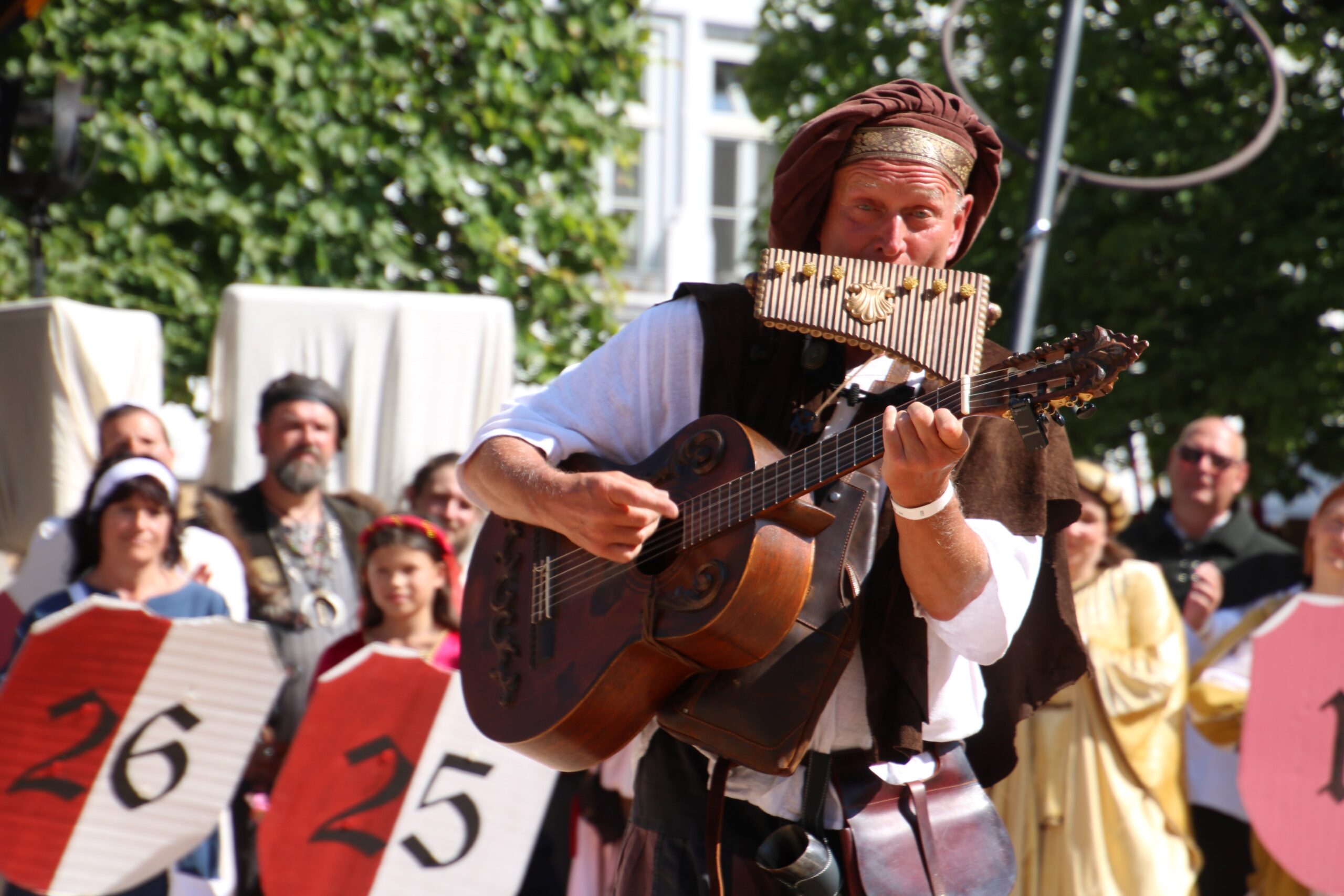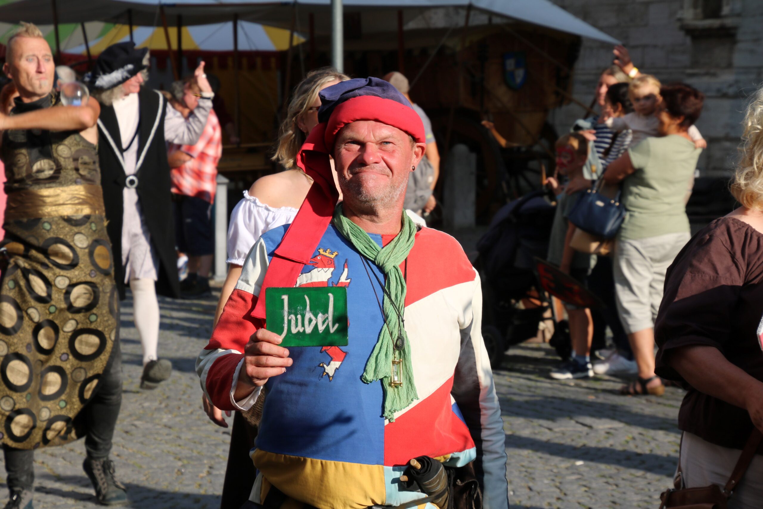 Ebenso ein Wiedersehen gibt es mit den Fahnenschwingern Signiferi Volantes, die ihre bunten Fahnen zur Musik wirbelnd beim Einzug und Auszug der Gaukler durch die Straßen ziehen.