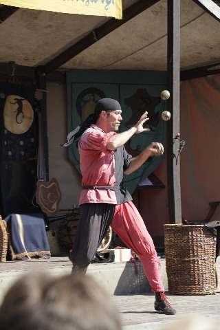 Dort wo eben noch die Straße war, ist jetzt seine Bühne. Lupus weiß wohl drum, das Volk um sich zu scharen. Mit Witz und brillanter Darbietung seiner Jonglagekünste zieht er jung und alt in seinen Bann. Er manipuliert drei einfache Holzkistchen so, dass dem Betrachter Zweifel kommen, ob die Schwerkraft wohl noch existiert. Lupus jongliert bis zu sieben Bälle, aber damit lange nicht genug.
