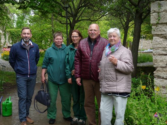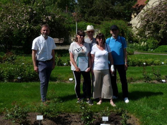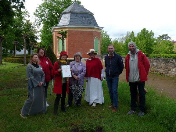 Nachträglich zu ihrem 50. Geburtstag pflanzte Frau Mary Fischer mit der Gästeführerzunft am 25. Mai 2021 im Friederikenschlößchen die Strauch-Rose “Prince Camille de Rohan”.