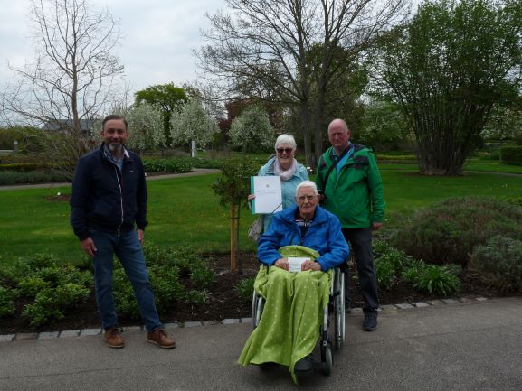 Anlässlich seines 95. Geburtstages pflanzte Herr Egon Preuster mit seiner Familie am 14. Mai 2021 im Rosengarten die Hochstammrose “Yellow Meilove”.