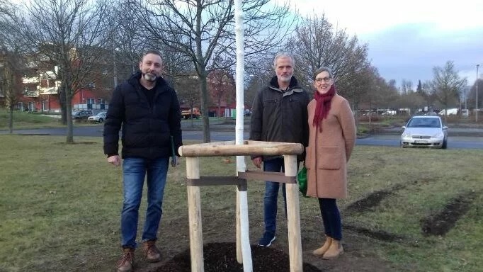 Zwei Bäume zurgleiche Zeit. Lydia Stollberg und Peter Beckus pflanzten am 13. Dezember auf dem Parkplatz Thermalbad für ihre Enkelkinder Leni, Karl, Arne, Ben, Mia und Anni einen Spitz–Ahorn und für Ihre World-Vision-Patenkinder Erik aus Peru und Gurungur aus Äthiopien einen Blut – Ahorn.
